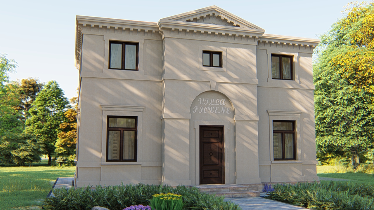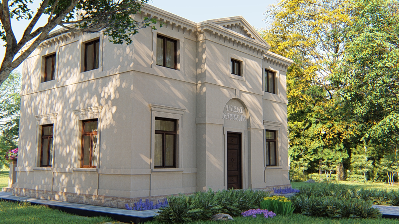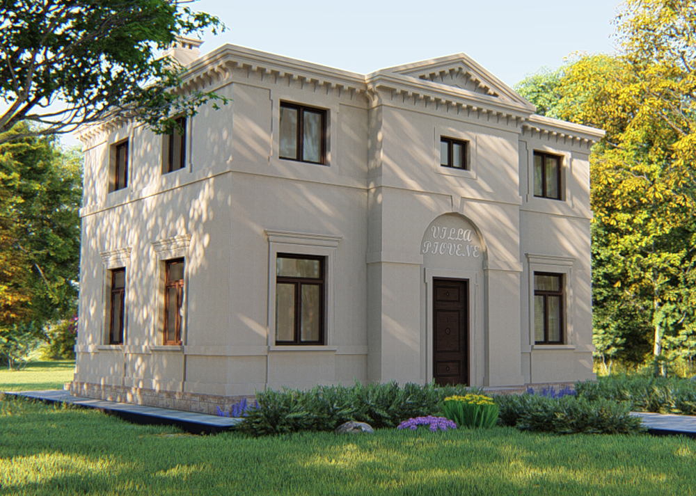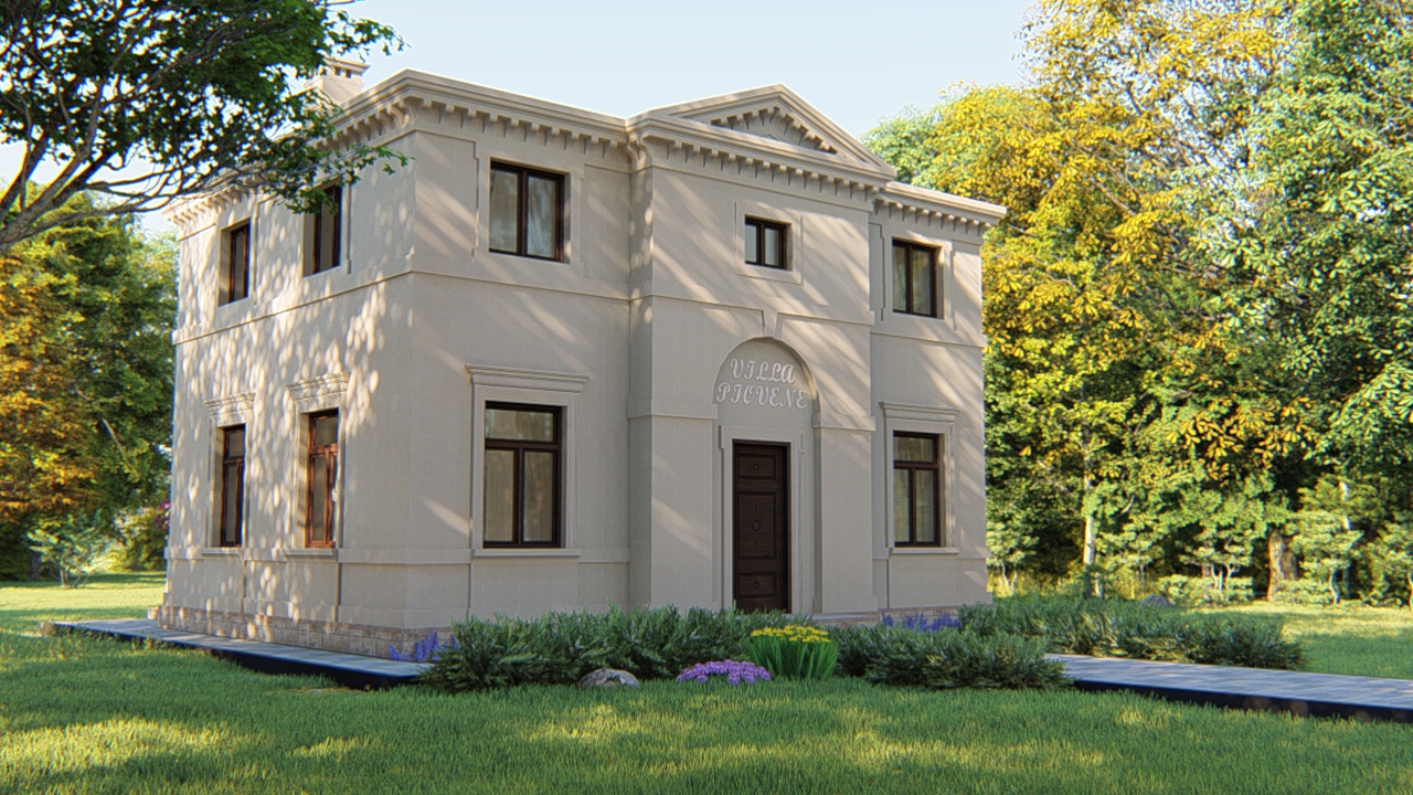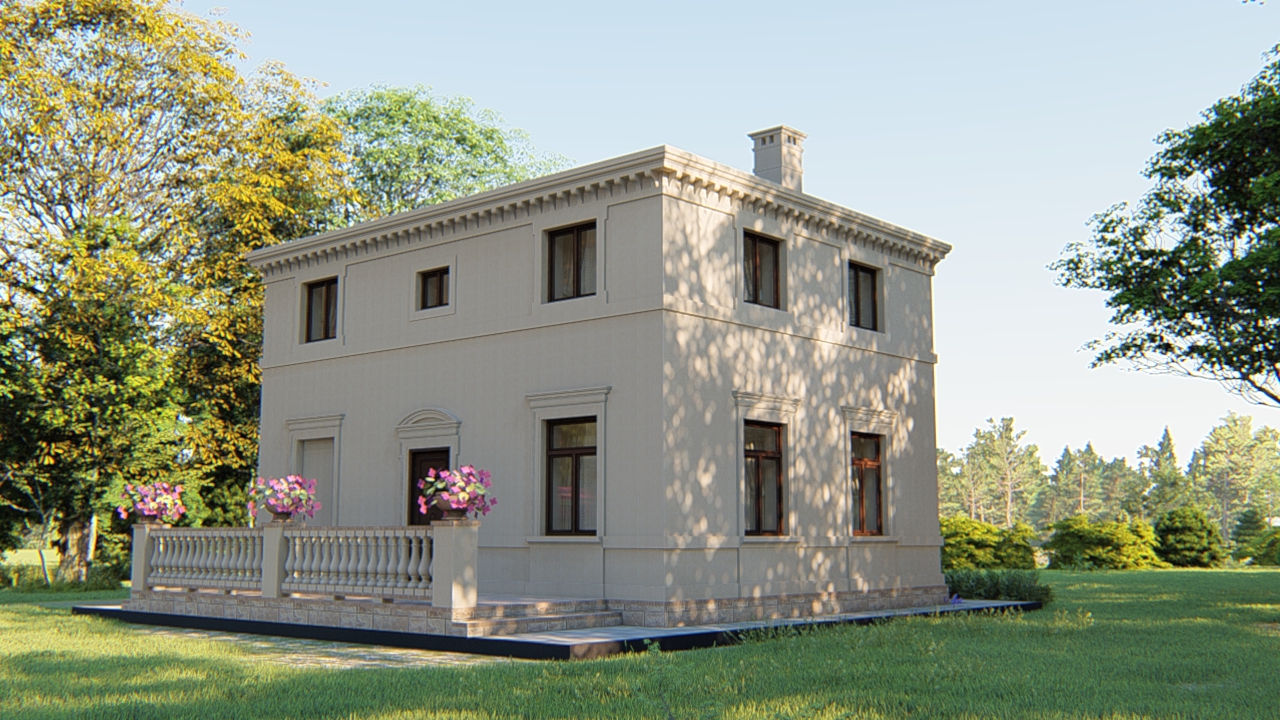Este vorba de o casă în stil paladian aparent mai modestă, dar care este de fapt destul de generoasă, cu spații și funcțiuni potrivite pentru o casă de vacanță (o vacanță liniștită și albă de zăpezi, cu familia sau prietenii, sau ambele, în care clipele de bucurie ne inundă și care ne îmbogățesc cu amintiri frumoase, o vacanță din peisajul căreia o astfel de casă ar trebui să fie nelipsită).