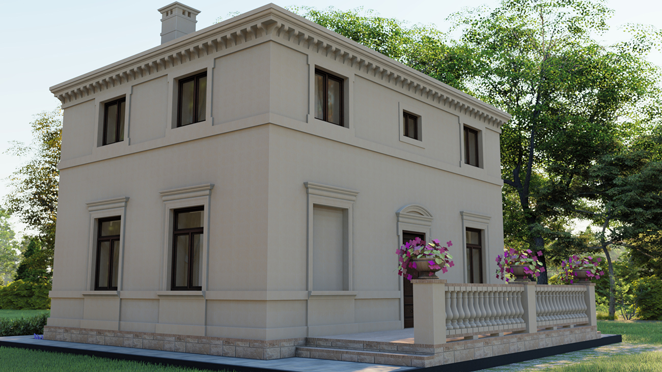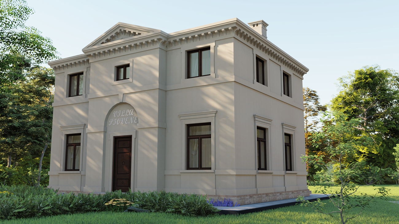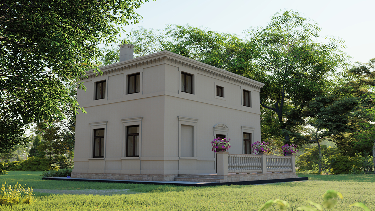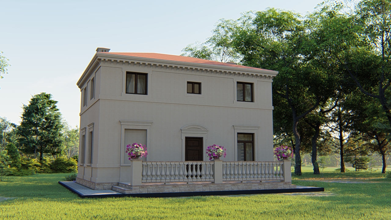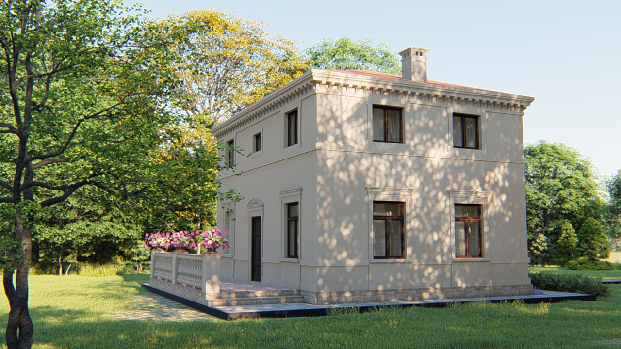 Este vorba de o casă în stil paladian aparent mai modestă, dar care este de fapt destul de generoasă, cu spații și funcțiuni potrivite pentru o casă de vacanță (o vacanță liniștită și albă de zăpezi, cu familia sau prietenii, sau ambele, în care clipele de bucurie ne inundă și care ne îmbogățesc cu amintiri frumoase, o vacanță din peisajul căreia o astfel de casă ar trebui să fie nelipsită).